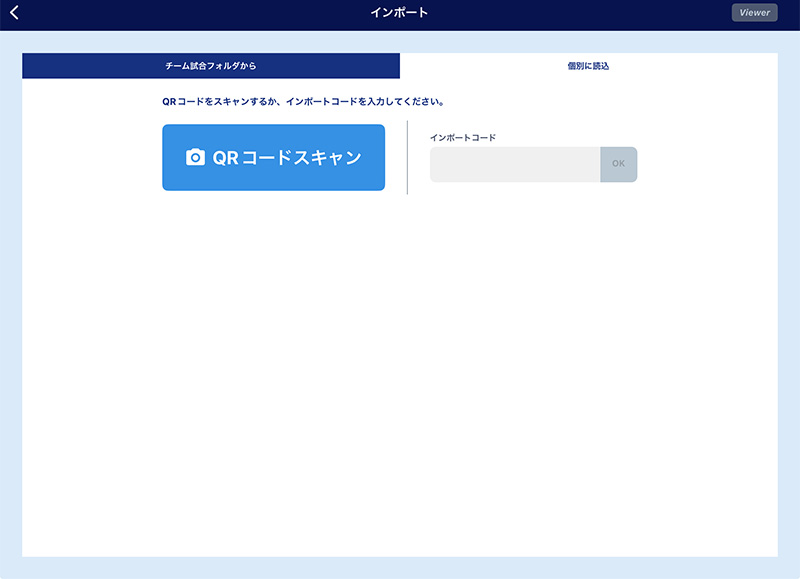 インポート画面のタブ「個別に読込」では、共有用のQRコードのスキャンか、インポートコードの入力のどちらかの方法を選択できます。