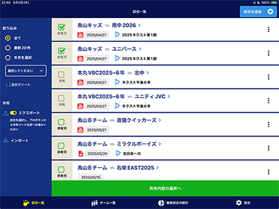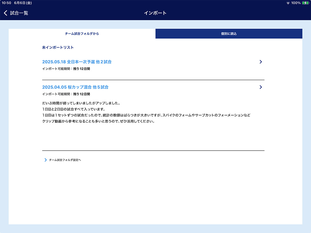 インポート画面のタブ「チーム試合フォルダから」には、まだインポートしていないリストが表示されます。