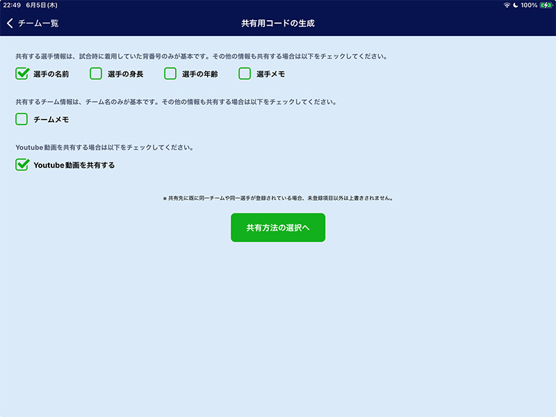 上の画面の「共有内容の選択へ」をタップすると、次にYoutube動画を含めるか、選手の名前などを含めるか、などの制限をかける設定画面になります。共有データにYoutube動画を含める場合、その動画が限定公開であっても共有相手からは見れるようになりますのでご注意ください。