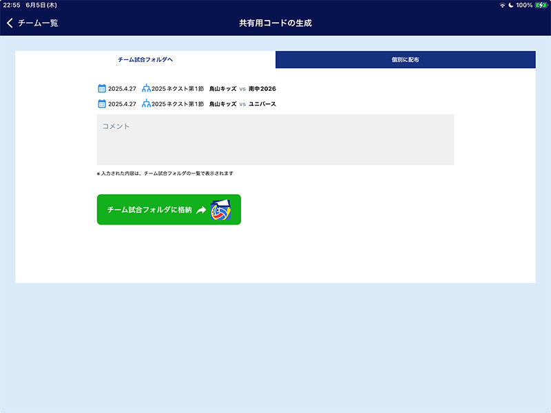 上の画面の「共有方法の選択へ」をタップすると、「チーム試合フォルダへ」「個別に配布」の2つのタブで共有方法を選べます。