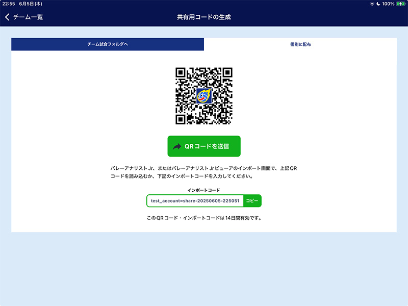 チーム試合フォルダに格納されている試合データにはインポート可能期間があります。このインポート可能期間は、エクスポートしてから14日間です。(個別に配布する場合のQRコードやインポートコードの有効期限と同じ)