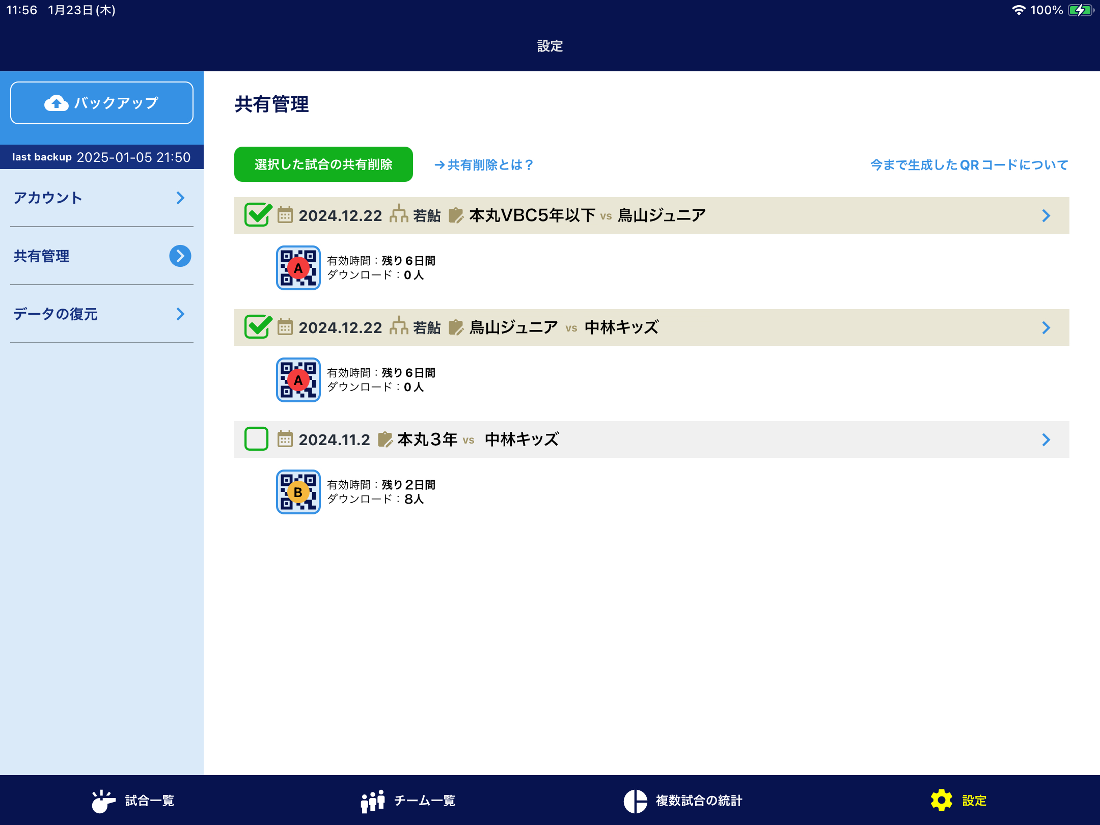 既に共有した試合情報を共有相手のアプリから削除したい場合は、アプリの下メニュー「設定」→「共有管理」より、共有削除したい試合を選択し、「選択した試合の共有削除」ボタンより削除することができます。(下画像)