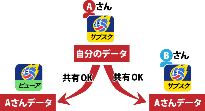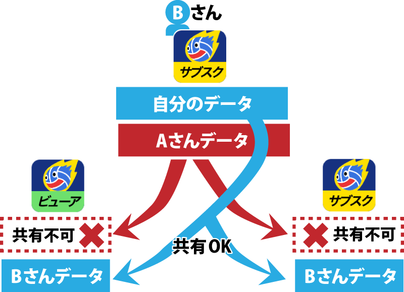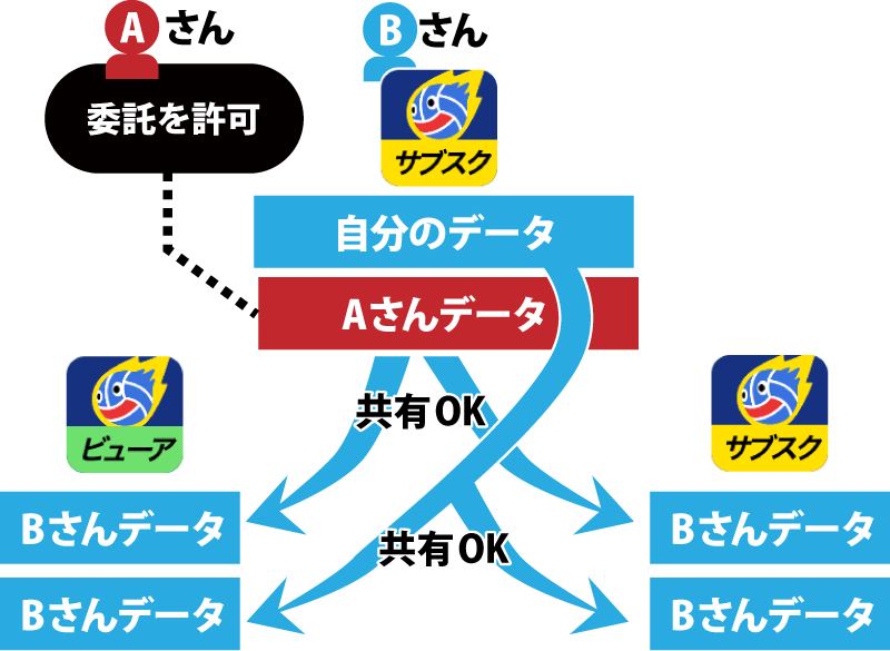 ただし、試合データの元の作成者(下の図のAさん)がアプリで「設定」→「共有管理」→「委託」にて、「このアプリから共有された試合が、共有先からさらに他ユーザへ共有されることを許可する」にチェックを入れている場合(すなわち委託を許可している場合)は、第三者へ共有することができます。その際、元の作成者であるAさんのデータとしてではなく、自分のデータ(Bさん)として共有データを提供することになるので、共有を受けた第三者がさらにその試合データを誰かに共有するには、AさんではなくBさんの委託の許可が必要にあります。