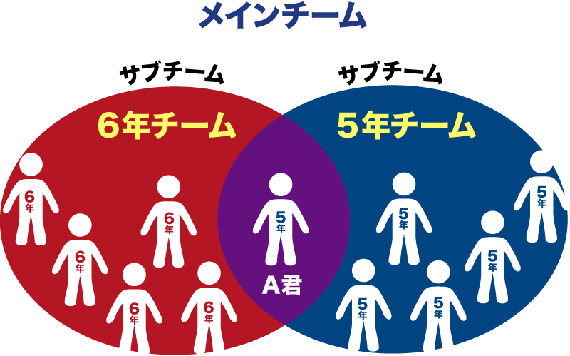 例えば、排球クラブの5年生の子(A君)が、5年生チームの大会と6年生チームの大会の両方に出場することがあれば、メインチームは「排球クラブ」、サブチームは「排球5年チーム」と「排球6年チーム」で、A君は両方に所属させることができます。