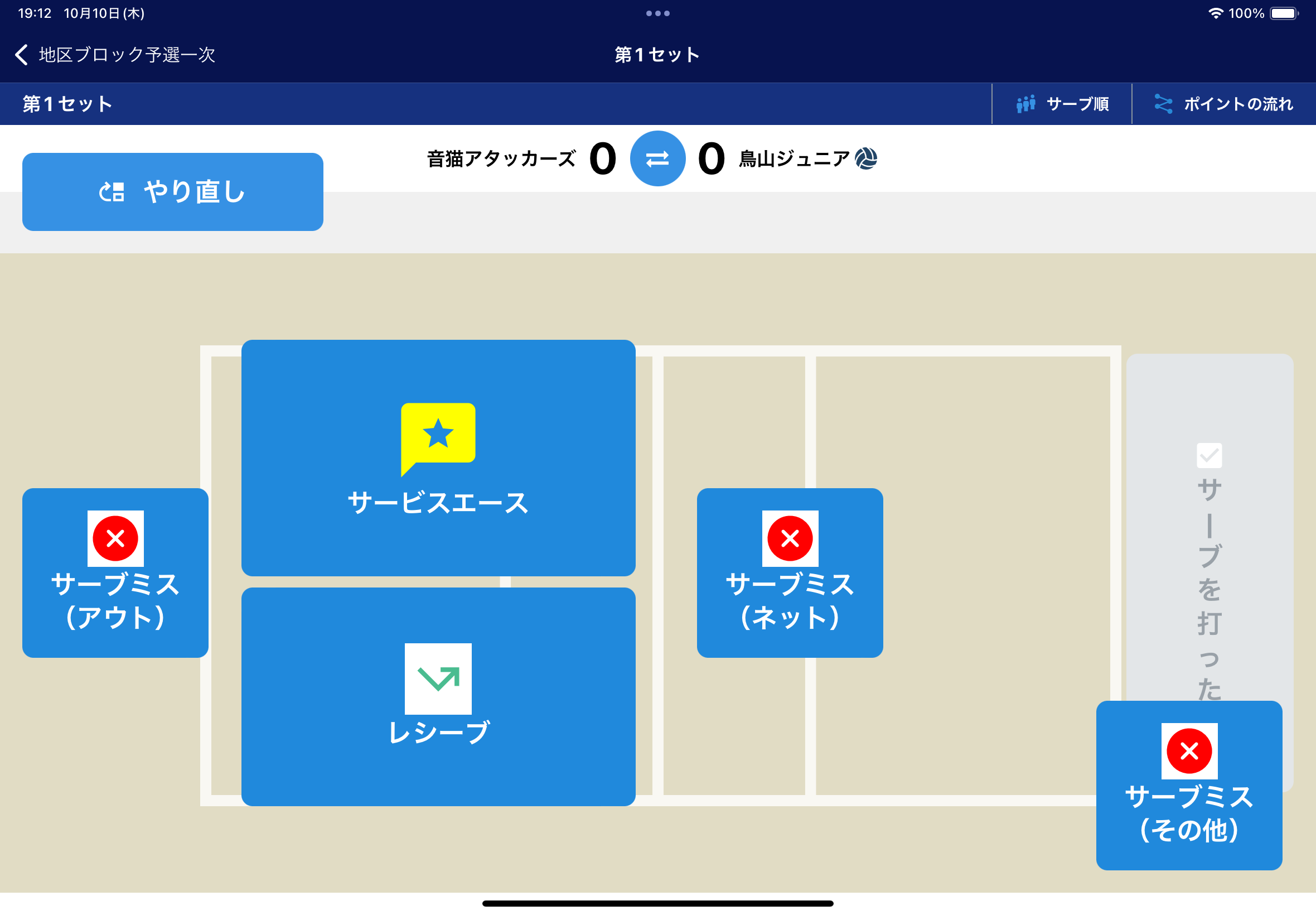 [サーブを打った][レシーブ][スパイク][返せず終わり]などのボタンが試合展開に合わせて出現するので、試合を見ながらタップしていきます。