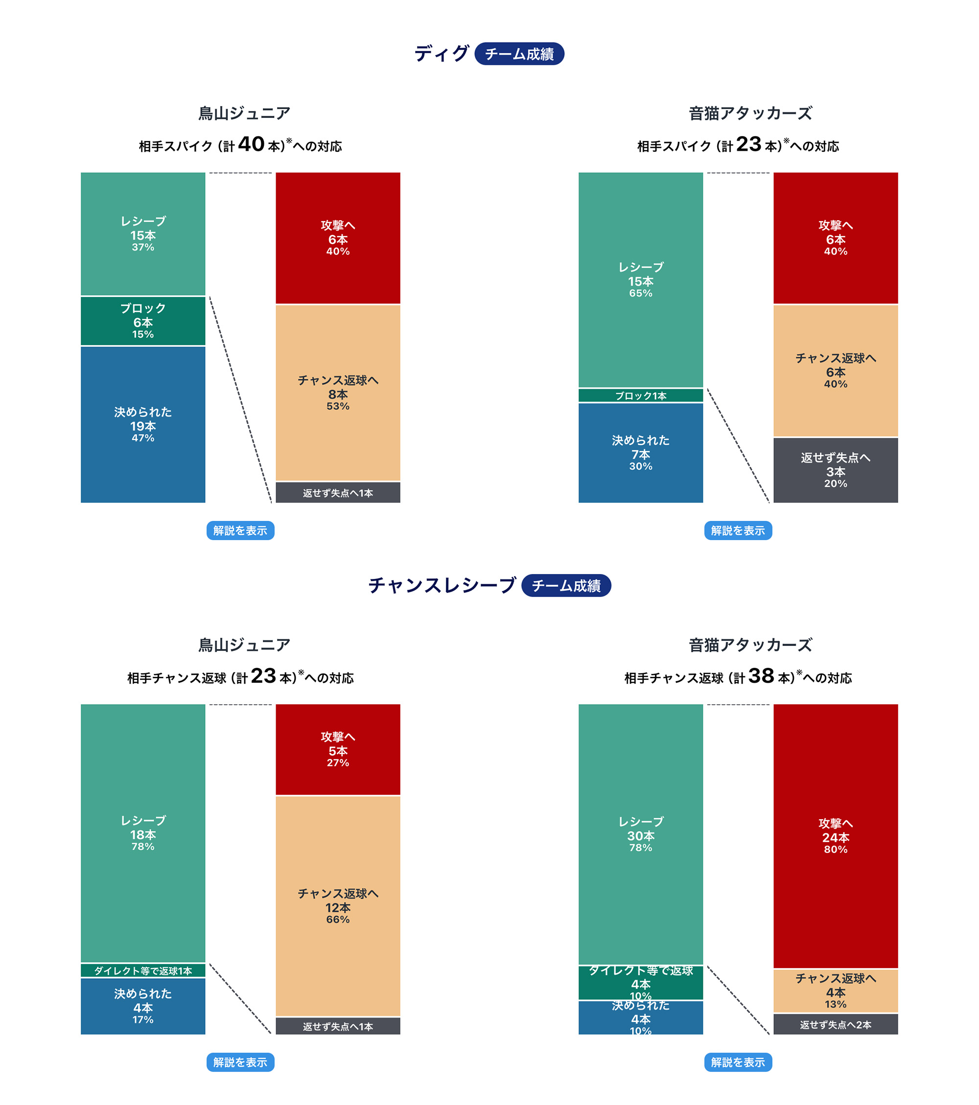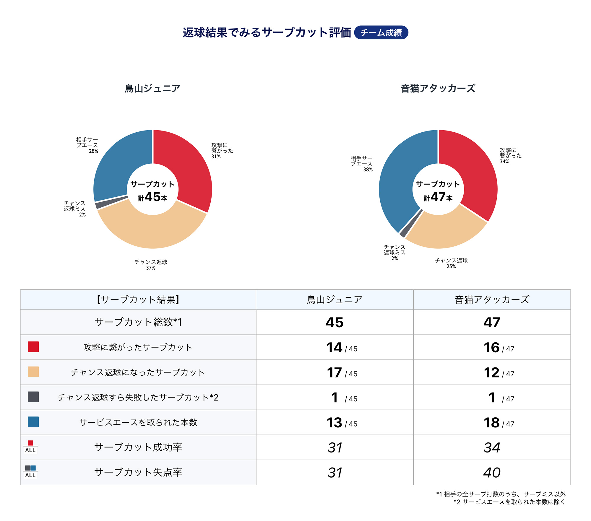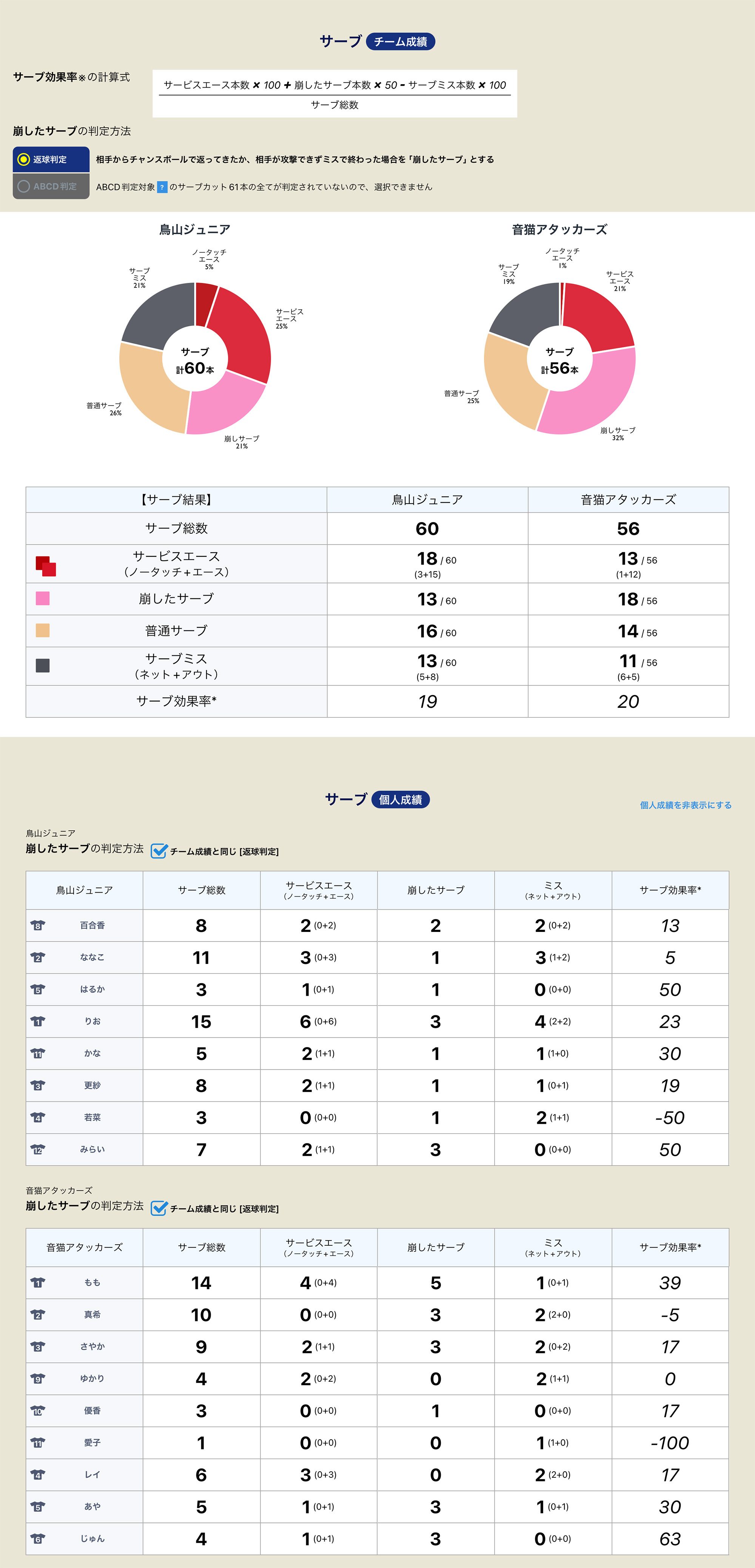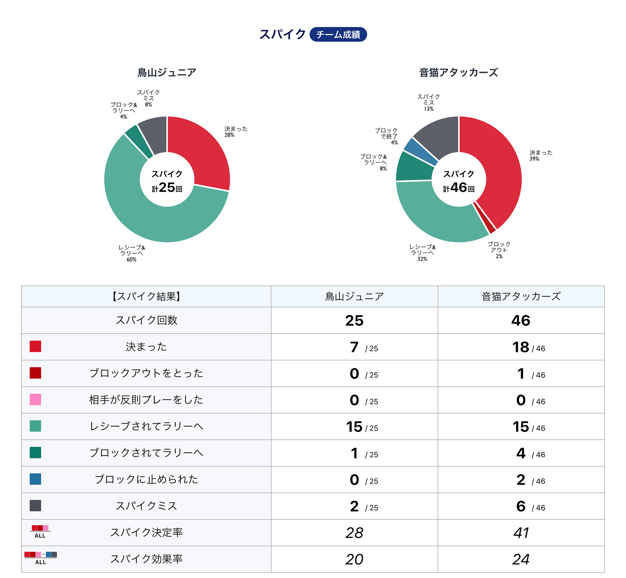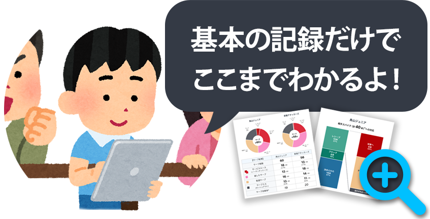 ここまでの❶基本の記録 だけでも、チーム全体のスパイク力、レシーブ力の評価、チームや個人のサーブ効果率など、得られる情報は多いです。