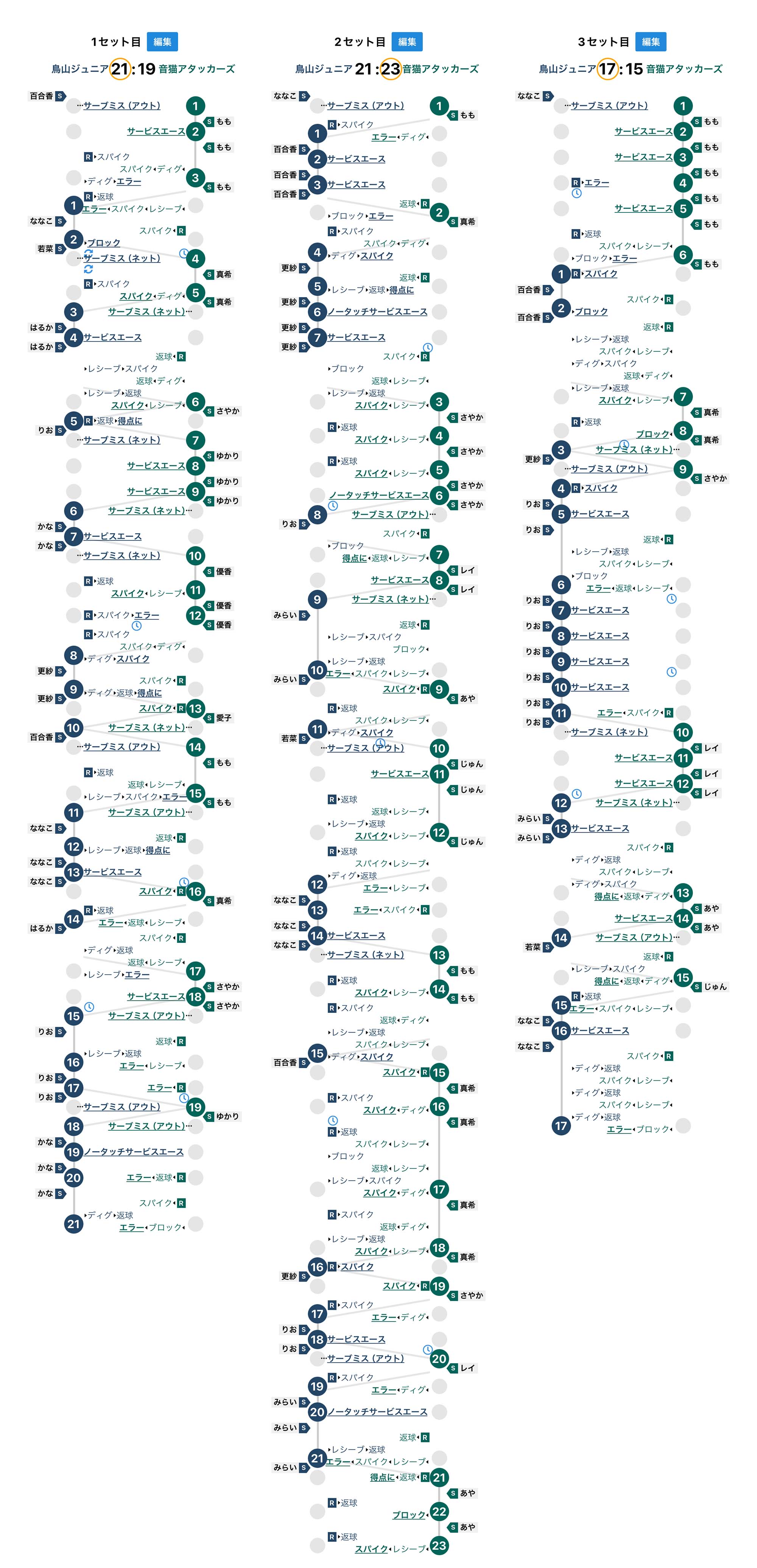 クリップ動画のプレーヤーによる絞り込みは、❶基本の記録 ではサーブのみ有効です(サーブ順から判断しているので)。サーブカットやスパイクなど、サーブ以外のプレーのクリップ動画でもプレーヤーによる絞り込みをしたい場合は、❷詳しい記録 にて記録する必要があります。