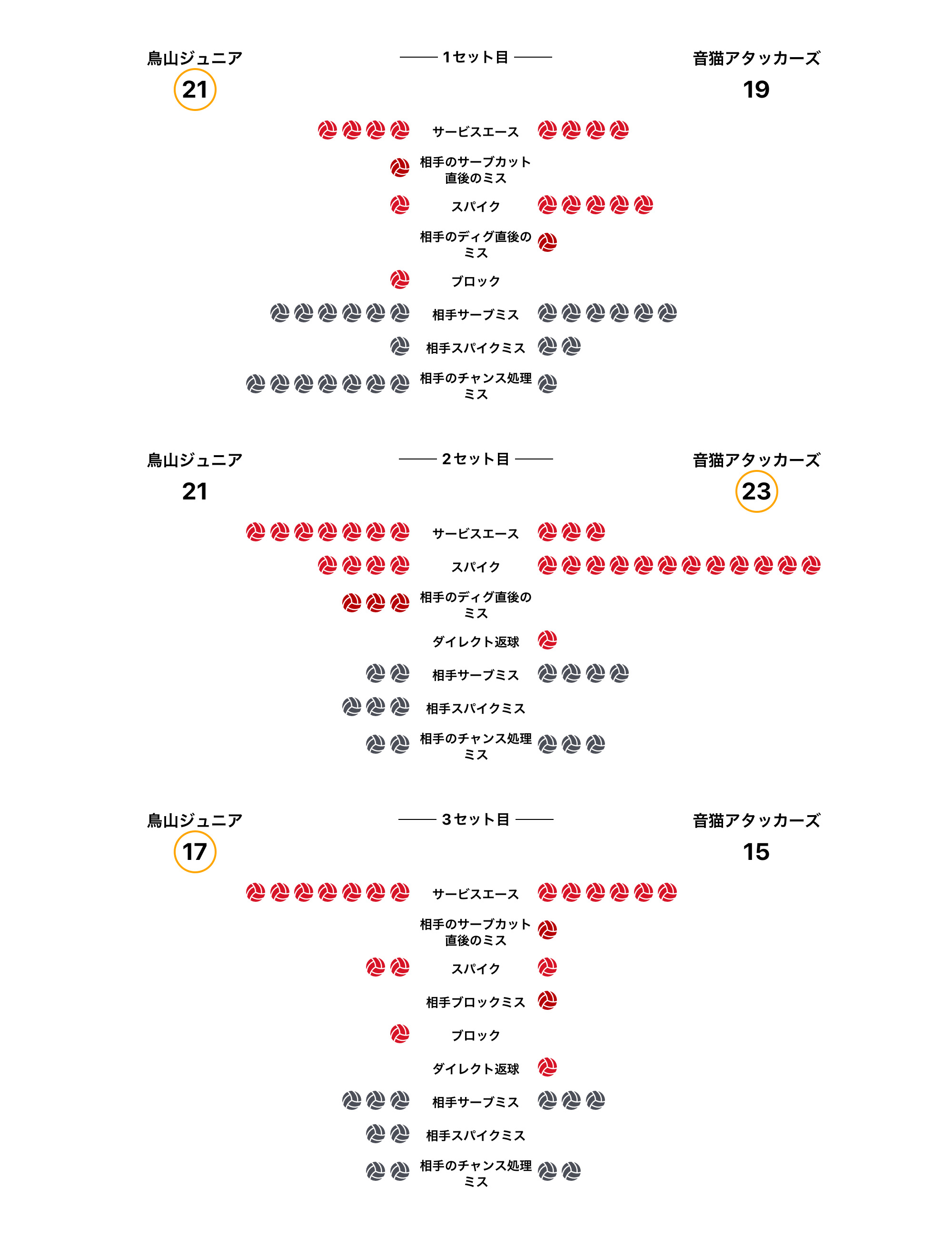 サーブやスパイクなど、ひとつひとつのプレーが自動でリピート再生されるので、映像を見ながら落ち着いてプレーヤーやコースなどを記録できます。