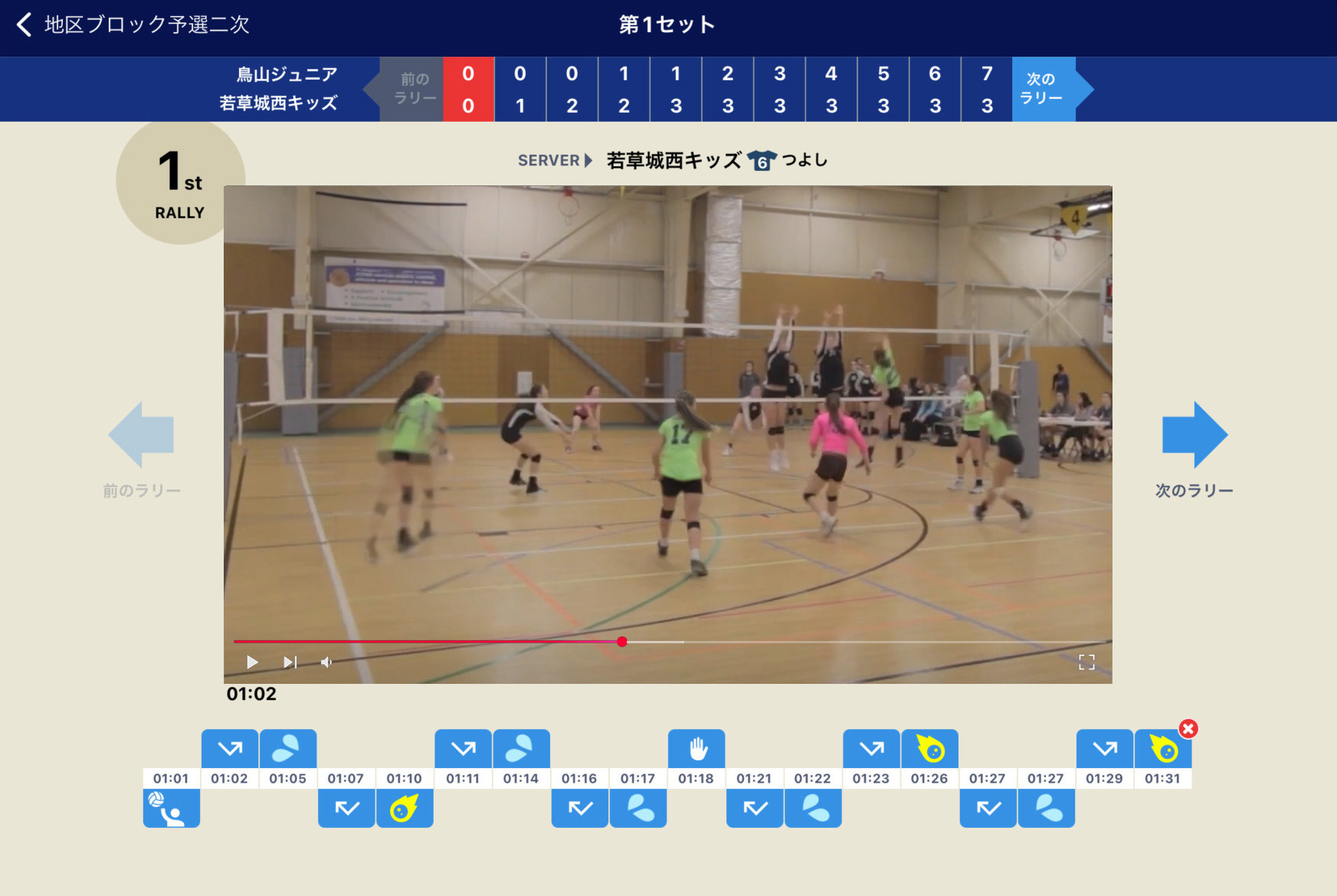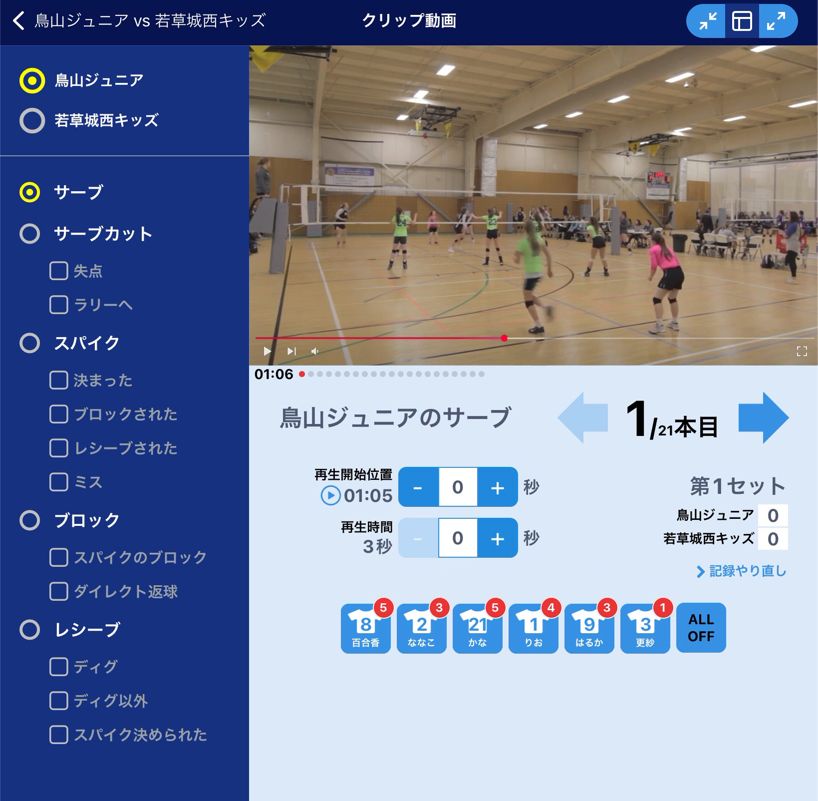 クリップ動画ではレシーブだけ、スパイクだけ、といった映像の再生ができます。※クリップ動画の再生開始時刻は、試合映像を見ながらボタンをタップしたタイミングになるので、プレーのタイミングとずれていた場合は次の❷詳しい記録 にて修正してください。